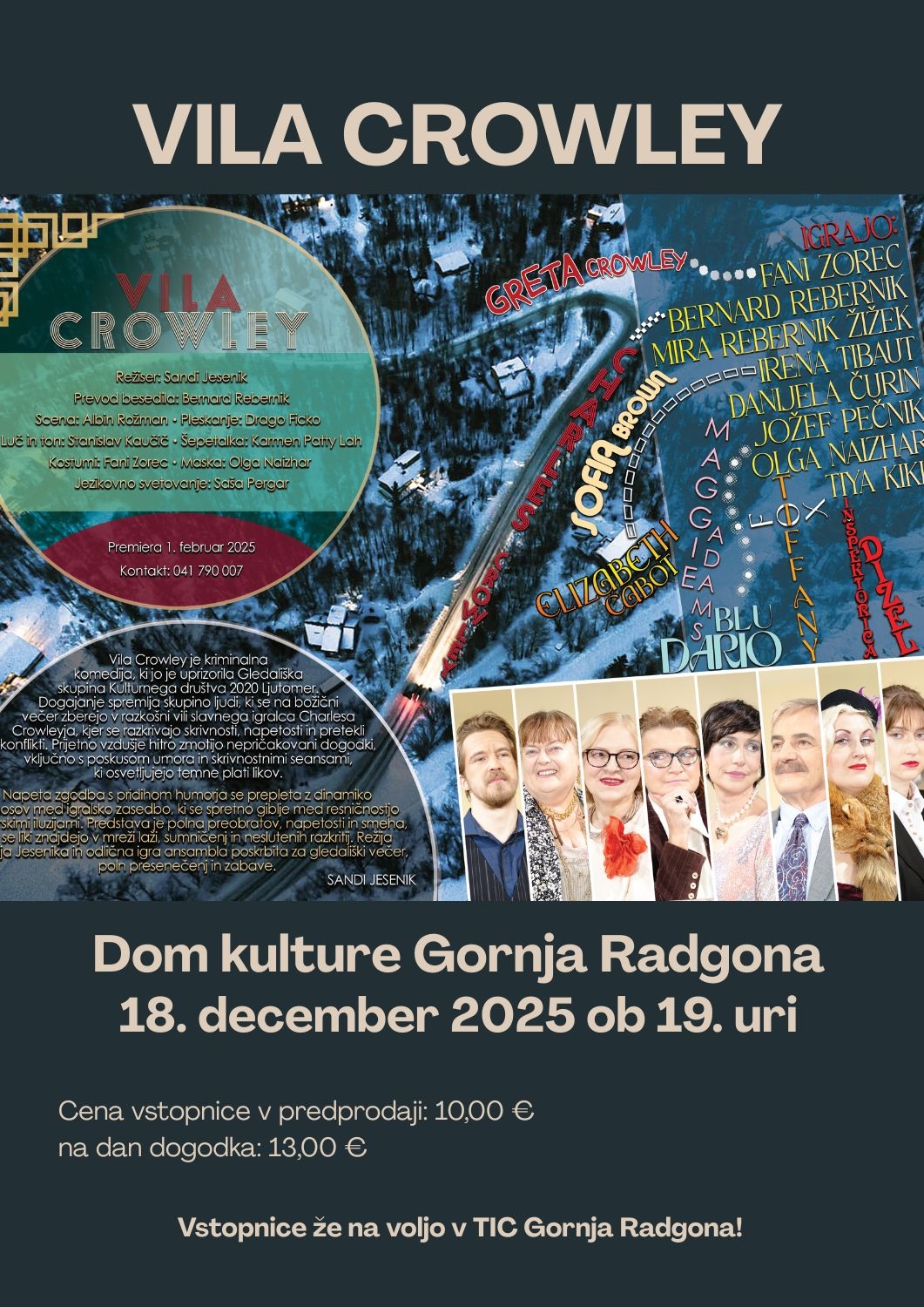 Vila Crowley je kriminalna komedija, ki se odvija v razkošni vili slavnega igralca Charlesa Crowleyja na božični večer. Zgodba prepleta elemente napetega kriminalnega zapleta in igrive komedije, ko se med povabljenimi začnejo razkrivati skrivnosti in napetosti, ki vodijo do nepričakovanih dogodkov – od skrivnostnega streljanja, umora odrskega vratarja Johna do iskanja resnice skozi seanso. Predstava spretno izpostavi dinamiko odnosov, polnih pretvarjanja, strasti in medsebojnega rivalstva.