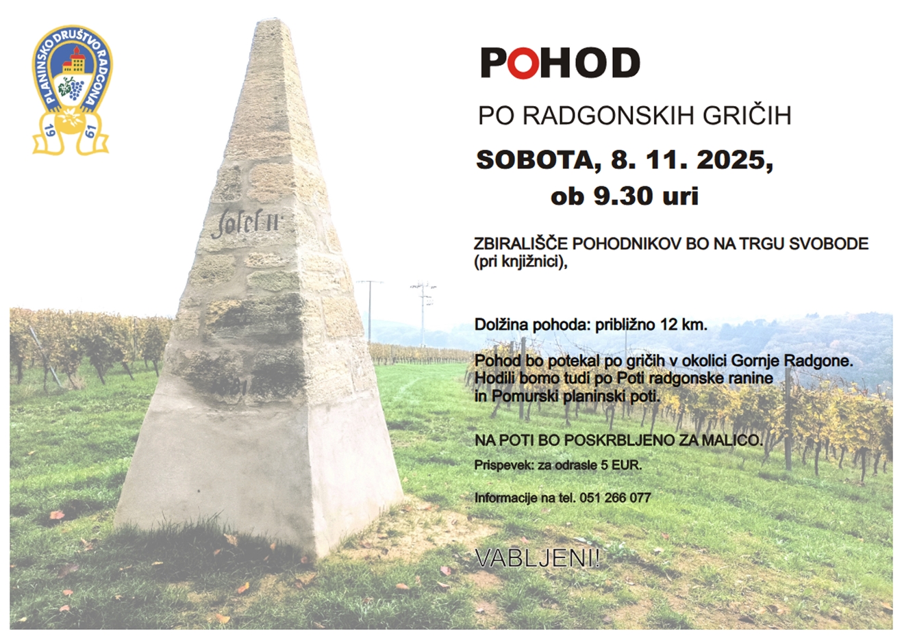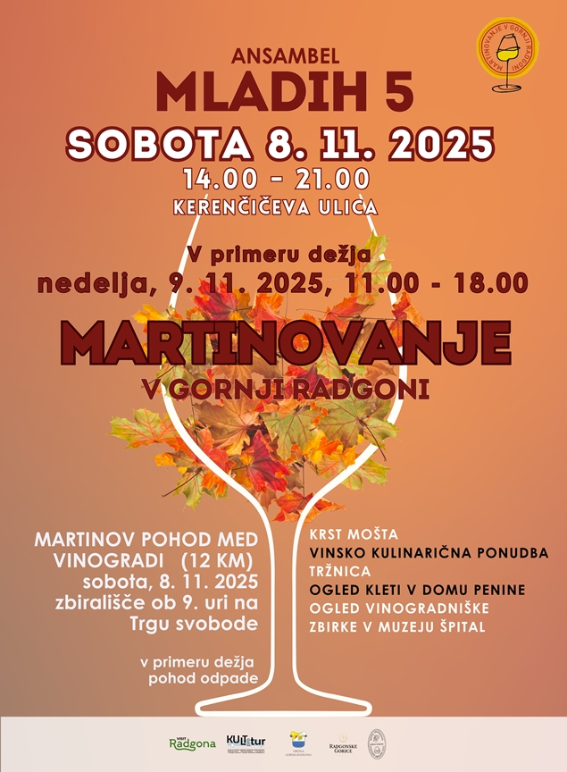 Begleiten Sie uns bei der Martinswanderung über die Radgonaer Hügel. Wir treffen uns um 9:00 Uhr am Trg svobode in Gornja Radgona (Platz vor der Bibliothek). Die Wanderung führt über Gornja Radgona–Hercegovščak–Police–Črešnjevci–Norički Vrh–Gornja Radgona und ist etwa 12 km lang. Die Wanderung wird von den Guides des Planinsko društvo Gornja Radgona geführt. Bei Regen fällt die Wanderung aus.