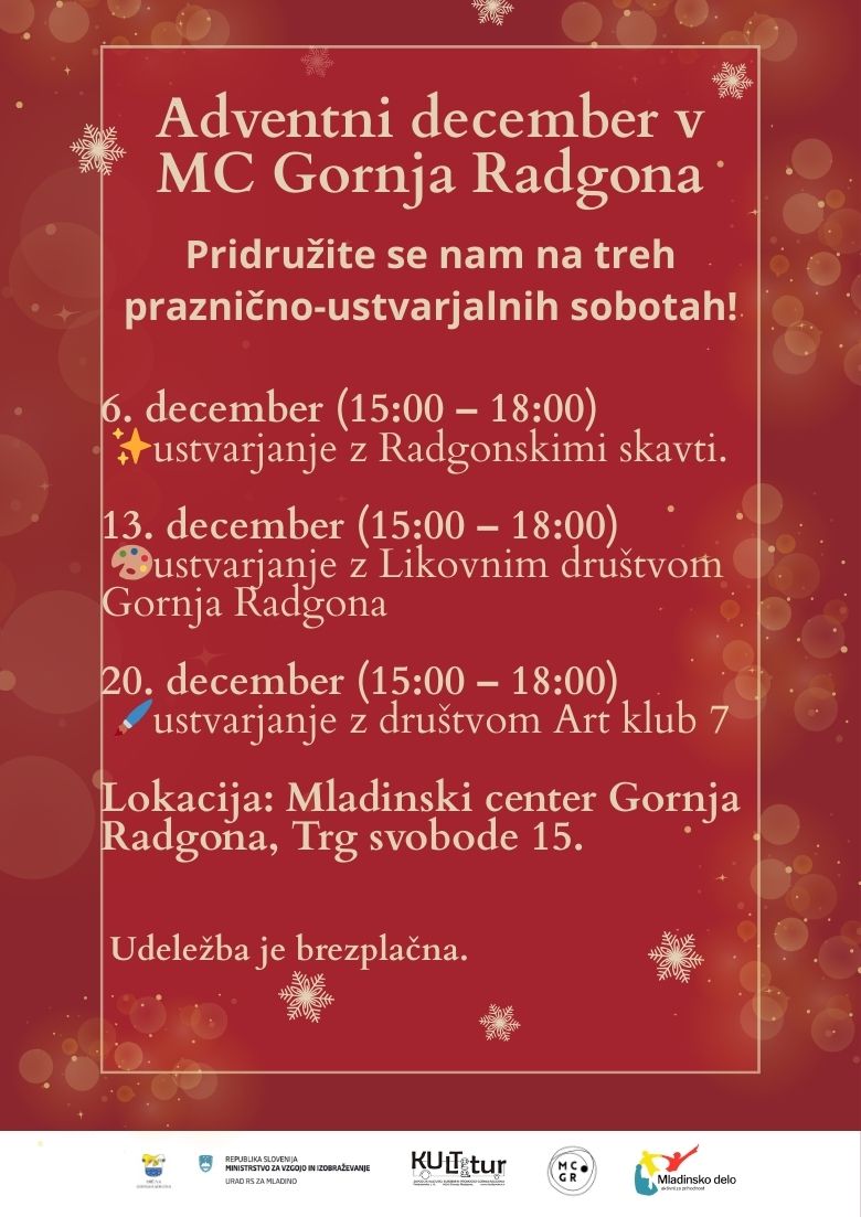 Delavnice bodo potekale ob sobotah (6.12., 13.12. in 20.12. 2025) med 15:00 in 18:00 v prostorih Mladinskega centra Gornja Radgona. Udeležba je brezplačna!