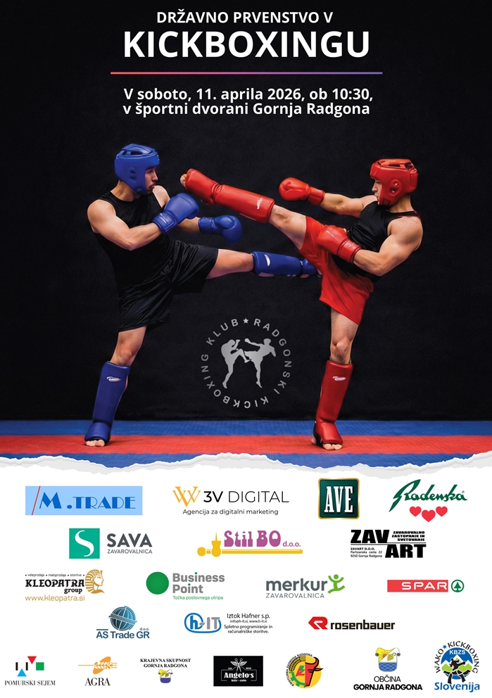 Radgonski kickboxing klub vabi na državno prvenstvo v kickboxingu, ki bo v soboto, 11. aprila 2026, s pričetkom ob 10.30 v Športni dvorani Gornja Radgona.