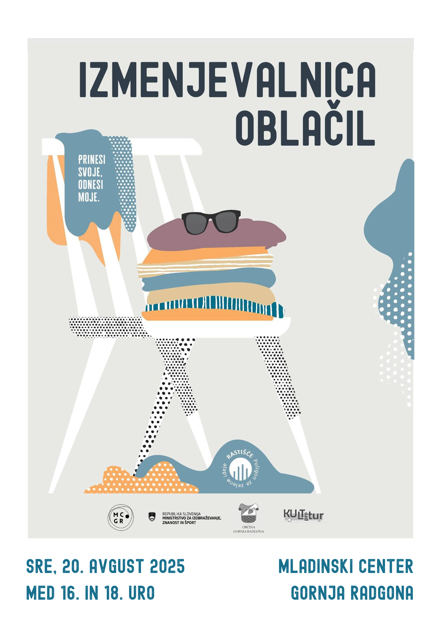 Sprejemali bomo le takšne sezonske kose oblačil, ki so še uporabni, ohranjeni in čisti. Če meniš, da oblačilo več ni nosljivo ga raje porabi za kakšen ustvarjalni projekt ali pa ga v zabojnik za tekstil odnesi sam/a (V Gornji Radgoni ga najdeš na Mladinski ulici ali pri trgovini Tuš).