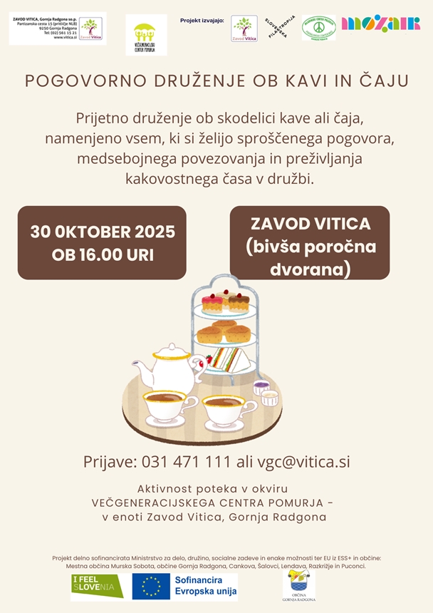 Vabljeni na prijetno druženje ob kavi in čaju, ki ga organizira Zavod Vitica. Družimo se v četrtek, 30. oktobra 2025, ob 16. uri v prostorih bivše poročne dvorane.