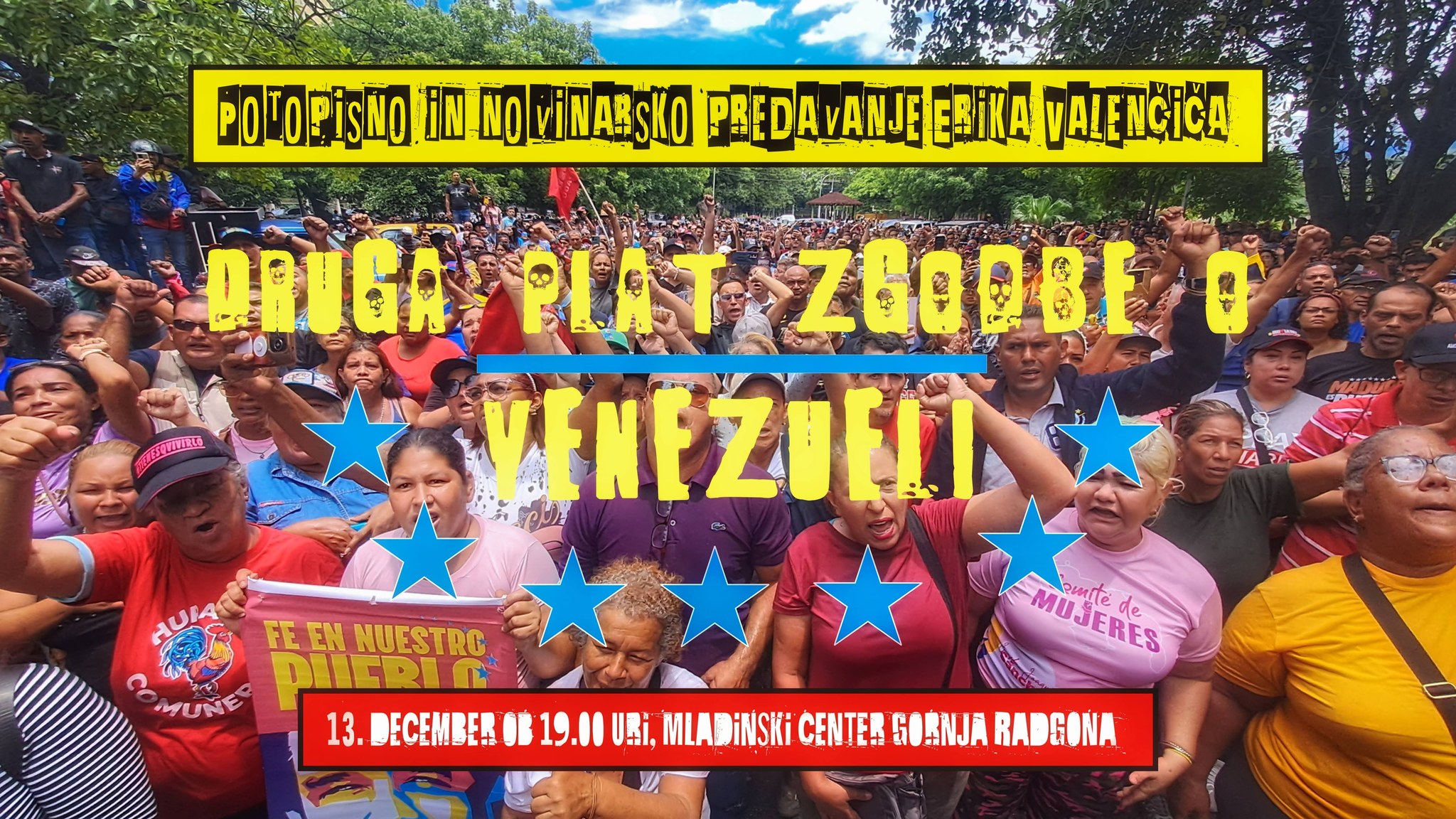 Valenčič je trikrat potoval po Venezueli, nazadnje januarja letos, in preučeval lokalne avtonomne skupnosti, od podeželskih socialističnih komun v osrčju venezuelskih planin do oboroženih, revolucionarnih skupin, imenovanih colectivos, ki so pred leti v faveli 23 de enero s sto tisoč prebivalci v Caracasu v uličnih bojih porazile pripadnike tolp in preprodajalce drog, izgnale policijo ter vzpostavile varnostni nadzor in avtonomno, ljudsko oblast. Tuji mediji vseskozi izpostavljajo več milijonov Venezuelcev, ki so v času najhujših ameriških sankcij zapustili državo, skorajda nič pa ne slišimo o milijonih drugih, ki z ustanavljanjem lokalnih, avtonomnih skupnosti sodelujejo v enem od največjih in najzanimivejših družbenih eksperimentov v vsej Južni Ameriki; ti predstavljajo morebitno alternativo neoliberalnemu sistemu, ki svet potiska v samouničenje. Valenčič bo predavanje podkrepil s fotografijami, ki jih je posnel med potovanji.