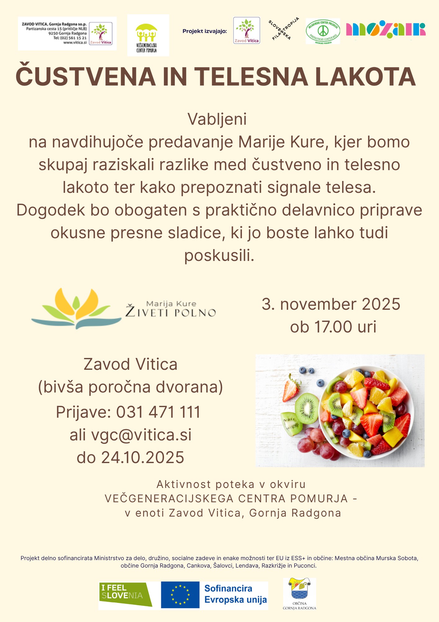 Vabljeni na navdihujoče predavanje Marije Kure, kjer bomo skupaj raziskali razlike med čustveno in telesno lakoto ter kako prepoznati signale telesa. Dogodek bo obogaten s praktično delavnico priprave okusne presne sladice, ki jo boste lahko tudi poskusili.