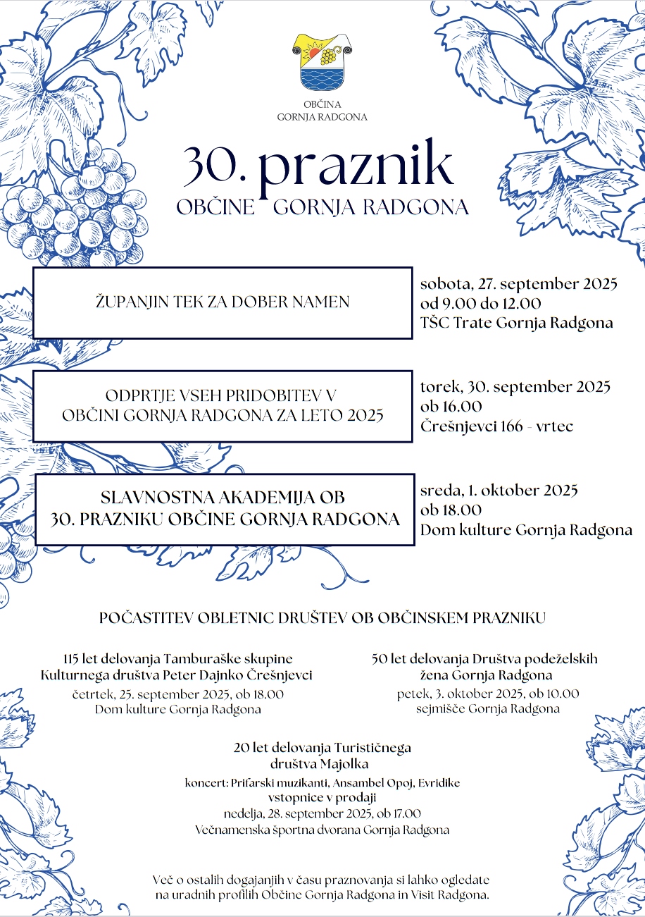 Občina Gornja Radgona letos praznuje 30. obletnico svojega obstoja, zato so za občane in obiskovalce pripravljeni številni dogodki, ki bodo potekali konec septembra in v začetku oktobra. Dogajanje bo združevalo šport, kulturo, predstavitev dosežkov občine in praznovanje obletnic lokalnih društev.