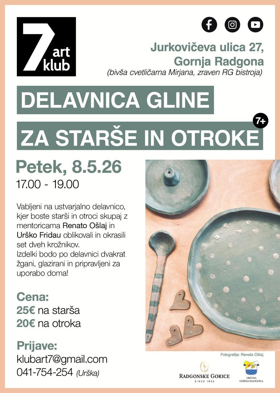 Art klub 7 vabi v svoje nove prostore (bivša Cvetličarna Mirjana na Jurkovičevi ulici 27 v Gornji Radgoni) na Delavnico gline za starše in otroke. Petek, 8. maja 2026, med 17. in 19. uro.