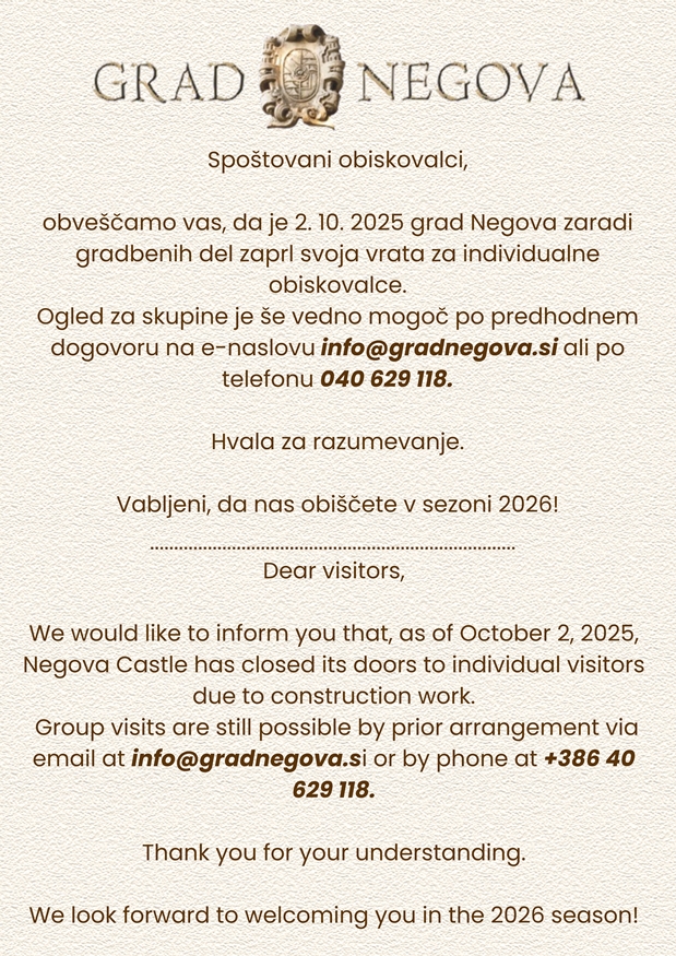 obveščamo vas, da je 2. 10. 2025 grad Negova zaradi gradbenih del zaprl svoja vrata za individualne obiskovalce.